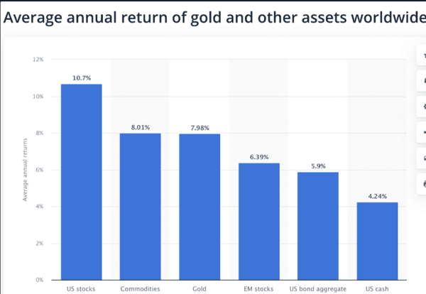 Bitcoin shows a huge upward spike by giving a 132% increase in the previous year, compared to gold, which gives only a 7.98% increase in its value. US stock gave a rise of 10.7%, whereas commodities are at a rise of 8.01%, and EM stock went up by 6.39%, according to Statistia data.