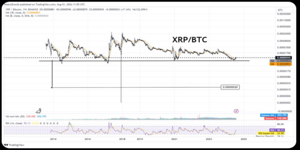 In a recent post in X, Brandt explained to his audience that this chart pattern is a complex head and shoulders developed over several years. If the chart breaks below the support line, all accounts with XRP in their names could gradually disappear forever.