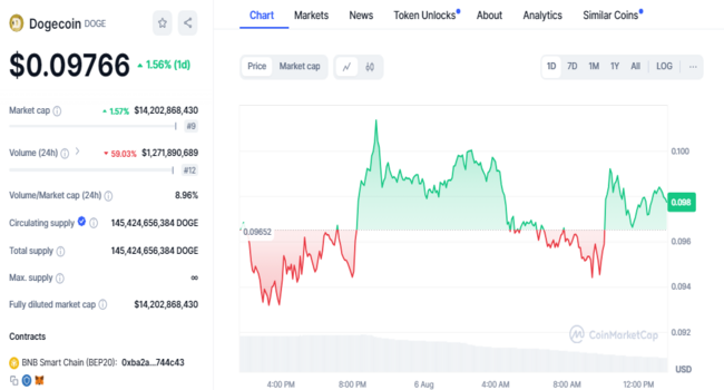 Currently, DOGE has risen by 15% in the last 24 hours with its value standing at $0.09766 At this time, the number of transactions has increased by 119 % and reached 16.