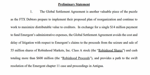 The latest on FTX bankruptcy settlement, where the crypto exchange agrees to pay $14 million to Emergent Technologies, resolving disputes over $600 million in Robinhood shares.
