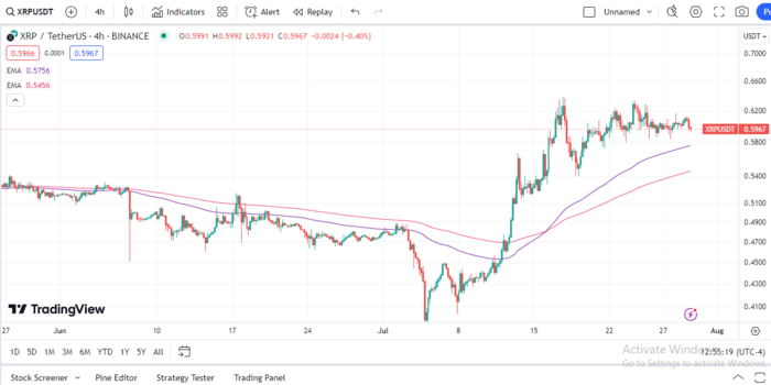 While talking about the moving averages of the token, the 50-day moving average is currently sloping upward, indicating a strong trend. The 200-day moving average is also heading upward and indicating a strong trend. The RSI of the token stands at 56.5 at the time of writing. In the four-hour time graph, analysts predicts the XRP price, it suggests a bearish trend as the 50-day and 200-day moving averages are bullish.