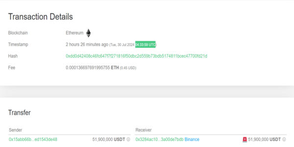 The first wallet made its transaction through the Ethereum blockchain by transferring a total of 63 million USDT at 03:11:59 UTC. The second transfer of funds on Binance took place at 03:36:23 UTC, and the third transaction was done at 04:33:59 UTC.