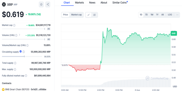 At the time of writing XRP is trading at $0.6190, XRP up over 19%. The trading volume of XRP is also over 270% which is $5.518 billion data collect from Coinmarketcap.