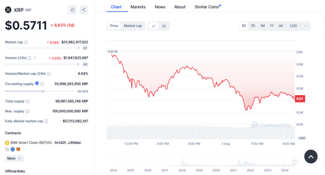 At the time of writing XRP is trading at $0.5715, the price of XRP is down over 6.50% in the last 24 hours. The trading volume of XRP is also down over 3%, which is $1.947 billion.