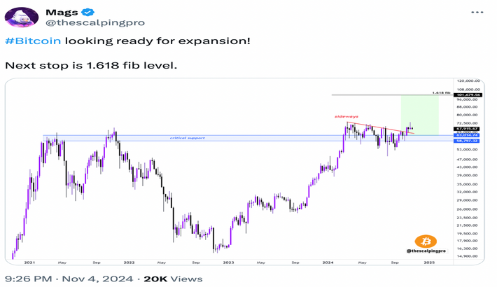 In a previous post on X, Mags saw Bitcoin trading at $67,915 and predicted it could rise to $101,679.