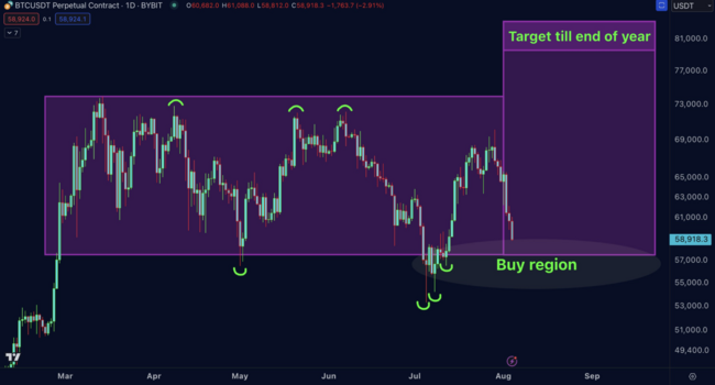 Doctor Profit has pointed out on X, that Bitcoin’s price typically moves between $72,000 and $56,000 – $57,000, marking the high and low points in his chart. While some in the community think this range is too wide, he argues that it’s quite accurate.