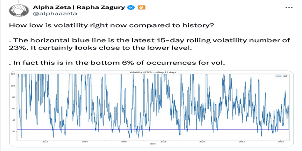 “The horizontal blue line is the latest 15-day rolling volatility number of 23%. It certainly looks close to the lower level,” Zagury stated in a June 7 post on X, pointing to the longest period in which bitcoin prices “stuck in a range.”