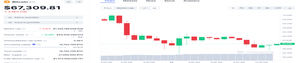Data collected from coinmarketcap shows Bitcoin trading at $67,309 and Ethereum at $3,687. Both coins didn‘t respond much to the awaited approval of Ethereum ETF news from the United States SEC.