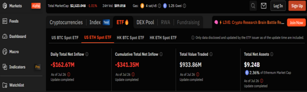 On July, 26th, the new spot Ethereum ETFs experienced significant outflows for the third straight day. Launched on Tuesday, July 23rd, these ETFs have seen a net outflow of approximately $341 million in their opening week.