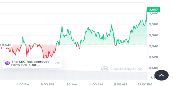 According to CoinMarketCap data, Ethereum is now trading at the mark of $3,607.