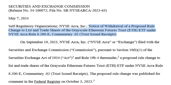The prominent player in cryptocurrency asset management, Grayscale, has surprisingly withdrawn its 19b-4 application for a futures Ethereum exchange-traded fund filed on May 7. In September 2023, this company was registered with the Securities and Exchange Commission, and it is now withdrawing its application to the SEC.