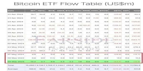 The Grayscale Bitcoin Trust (GBTC) recorded major outflows on May 7, and 9. This outflow was worth $28.6 million and $43.4 million, respectively. On these days, Grayscale was the only one to report the outflow of funds, as it failed to keep up with the pace of inflows.