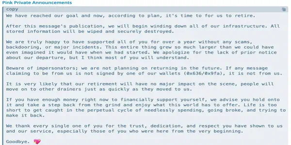 Pink Drainer announces retirement after reaching a milestone of $85 million in stolen assets, renowned for enabling cryptocurrency thefts.