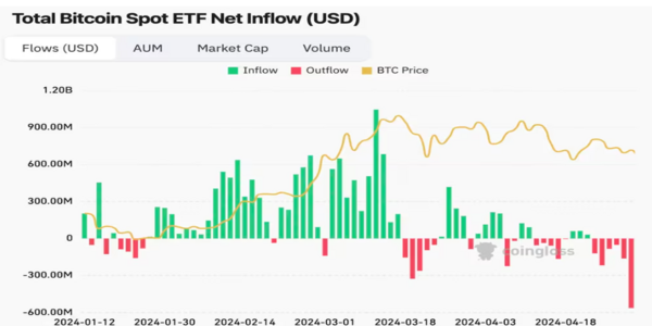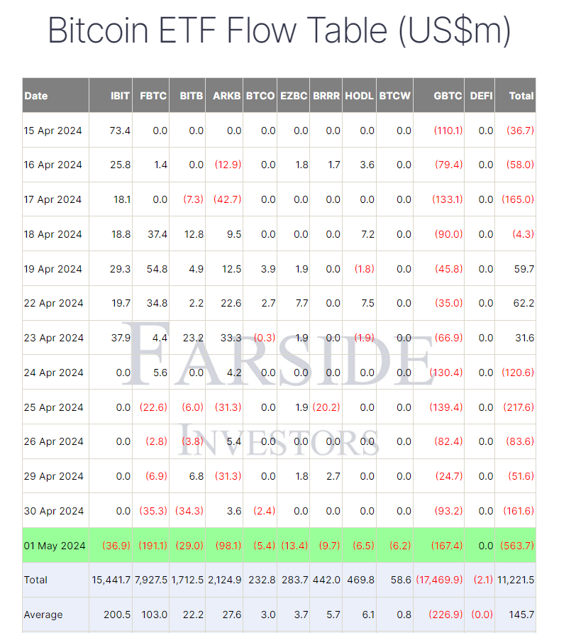 Sales calculated on this day by 11 US-based ETFs are $563.7 million. This is the largest since the EFTs started trading in January. This extends to a five-day sale trend, according to the data gathered from Farside Investors and CoinGlass. Total withdrawals made by investors from US-based EFTs have totaled $1.2 billion since April 24.