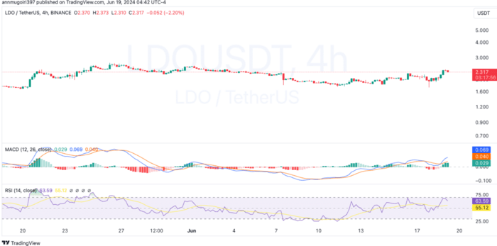 The 4-hour technical indicators for LDO prove to be a bullish signal since the MACD line (blue) rises above the signal line (orange).